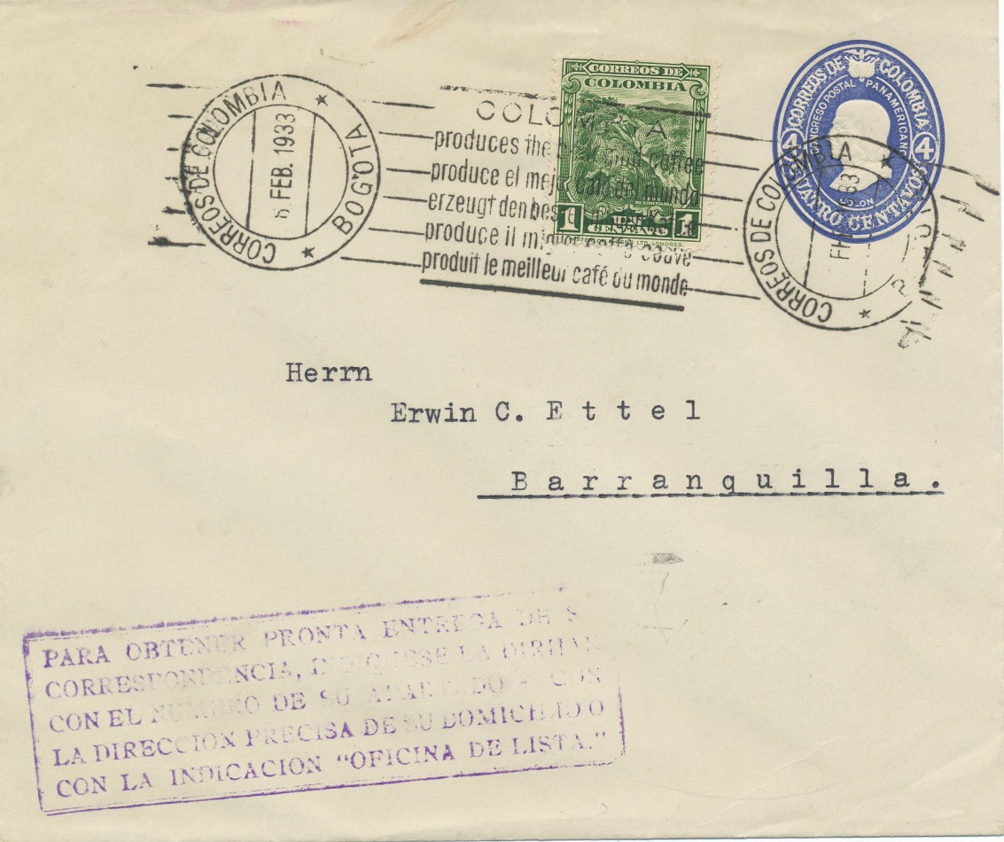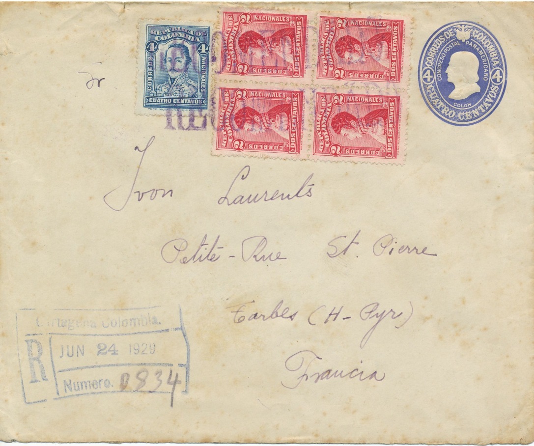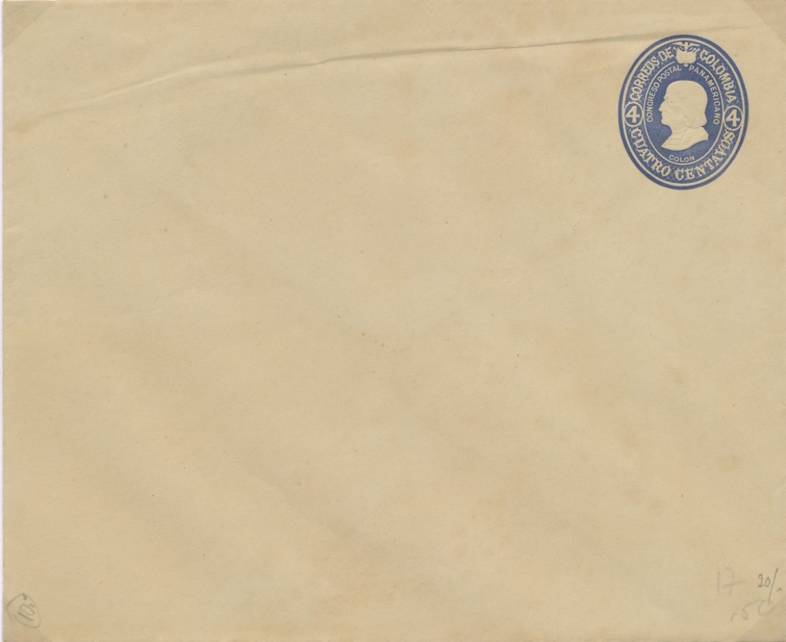 El año 1.925 y bajo la Presidencia de Pedro Nel Ospina Vásques, se imprimió este sobre pre-franqueado, el sello representaba a Cristóbal Colon, y de formato era muy parecido al del año 1.932, solo que en esta ocasión el valor era de cuatro centavos, a diferencia de los anteriores este sobre fue muy utilizado, hasta el año 1.934.-