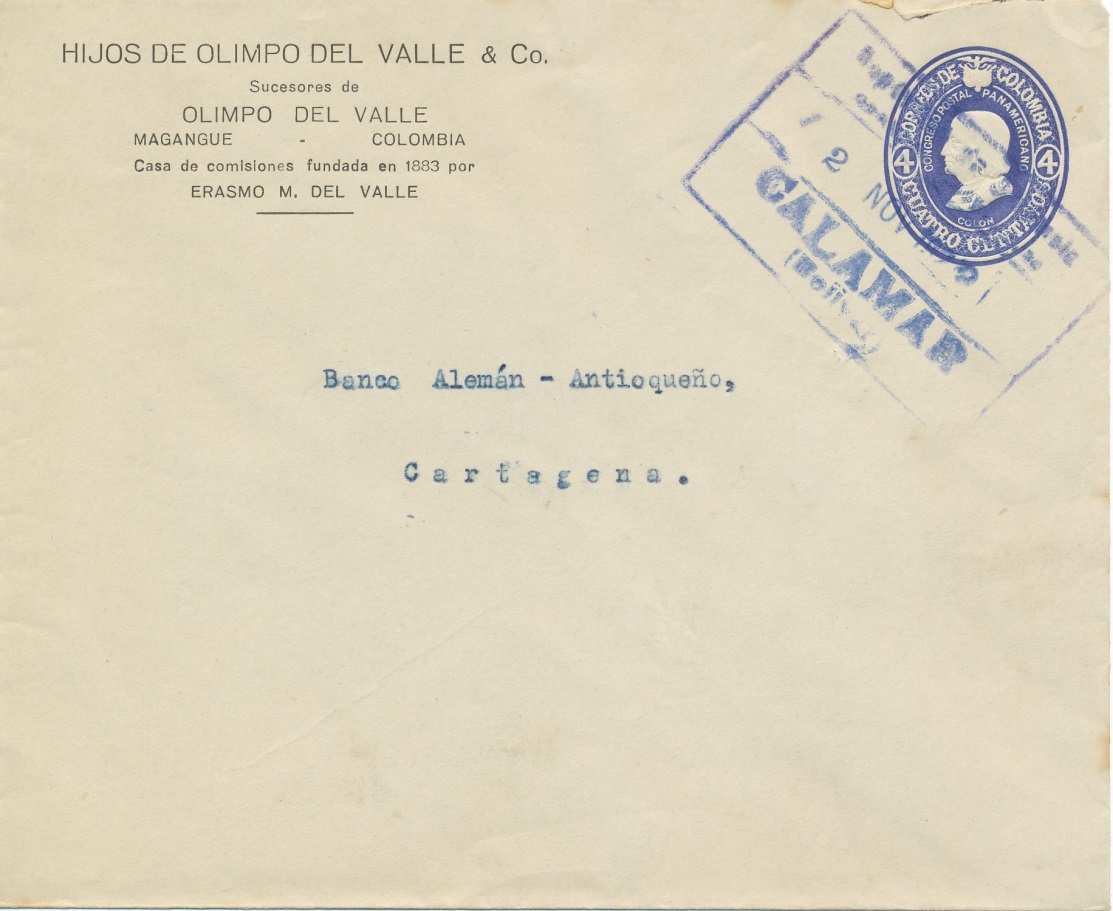 Sobre impreso por “Hijos de Olimpo del Valle” carta enviada desde Calamar a Cartagena el dos de noviembre de 1.928.-