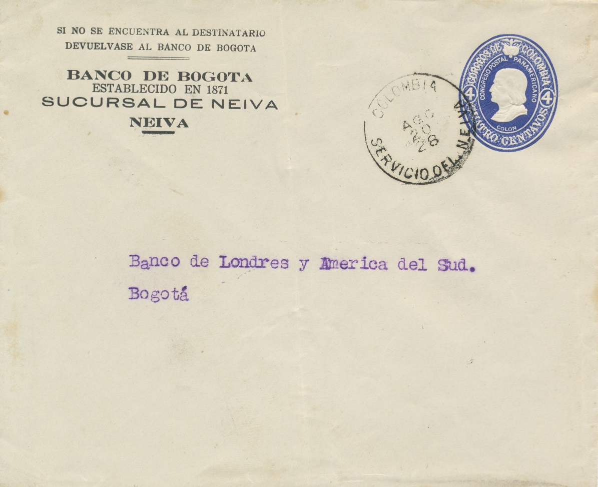 Carta enviada desde Neiva el 20 de agosto de 1.928 a Bogotá.-