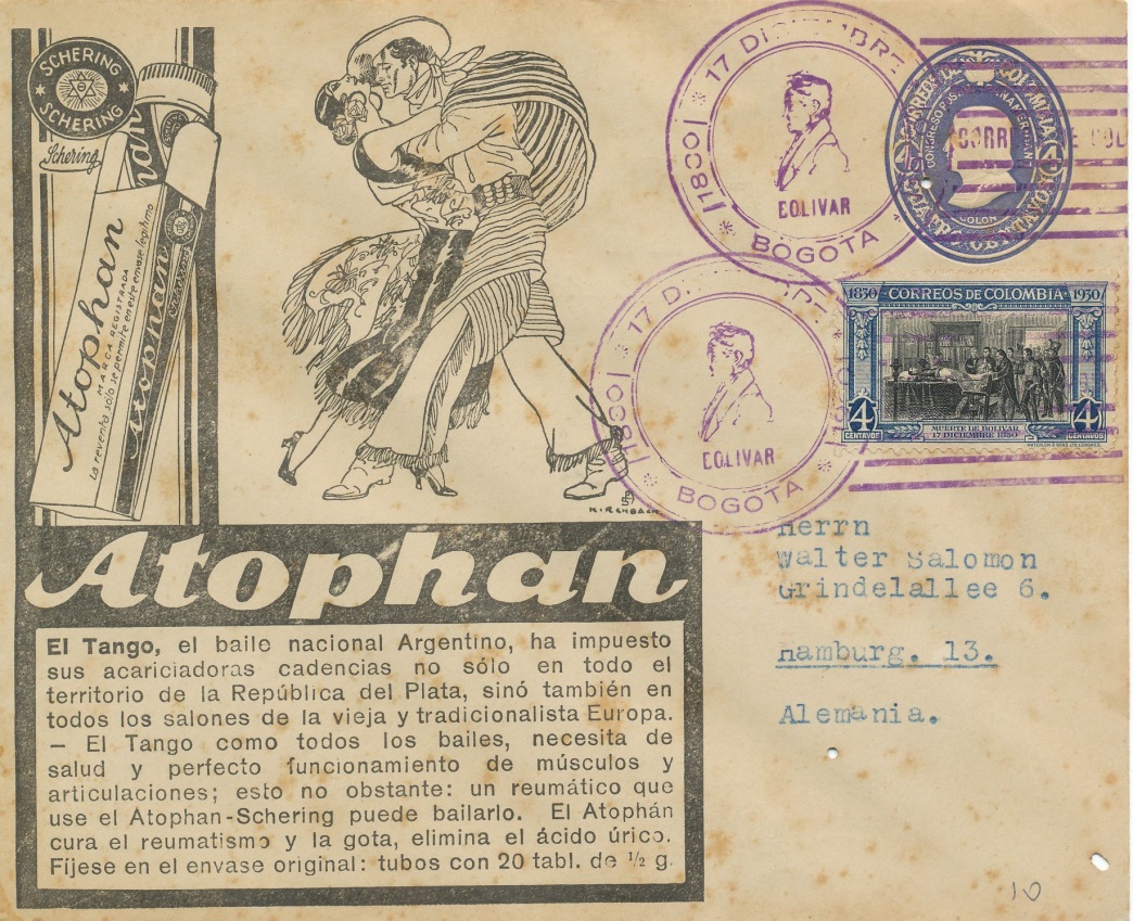 Carta enviada desde Bogotá a Hamburgo, con impresiones tanto en el frontal como en la parte posterior (17 diciembre de 1.930).-