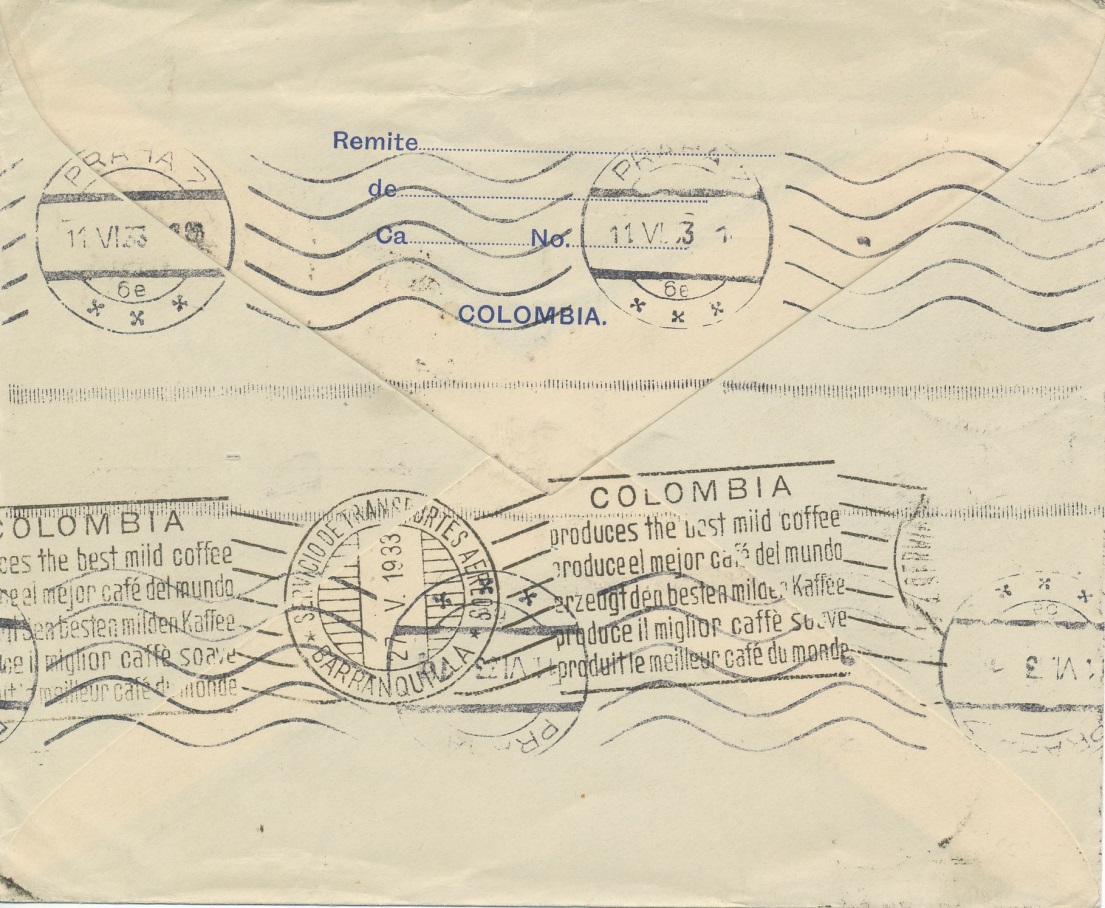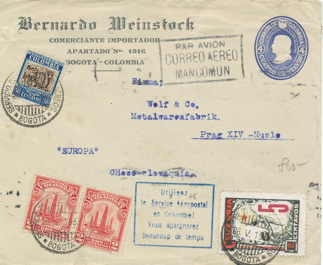Sobre impreso “Bernardo Meinstock” enviado desde Bogotá a Praga, el 28 de mayo de 1.933.-