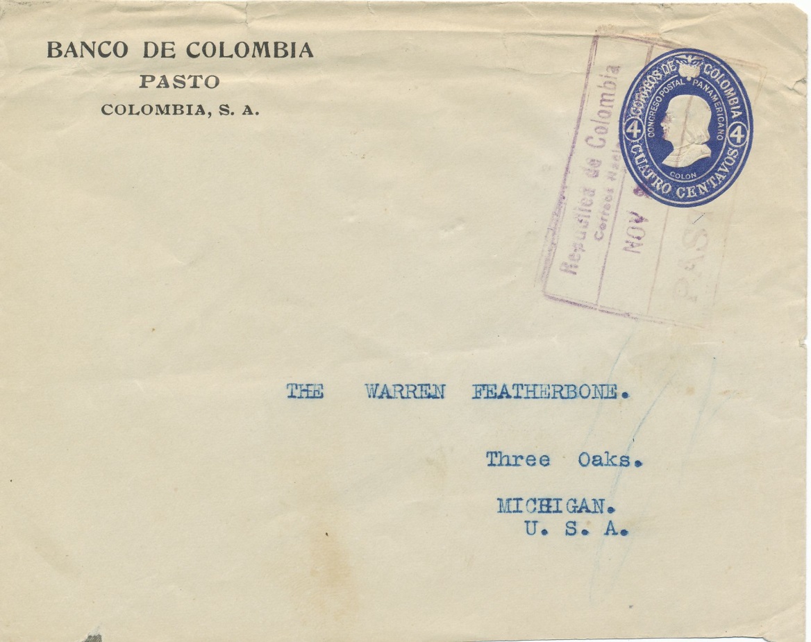 Sobre de la oficina de Pasto, Banco de Colombia, enviado a Michigan sin más señal de paso que el matasellos de salida de Pasto.-