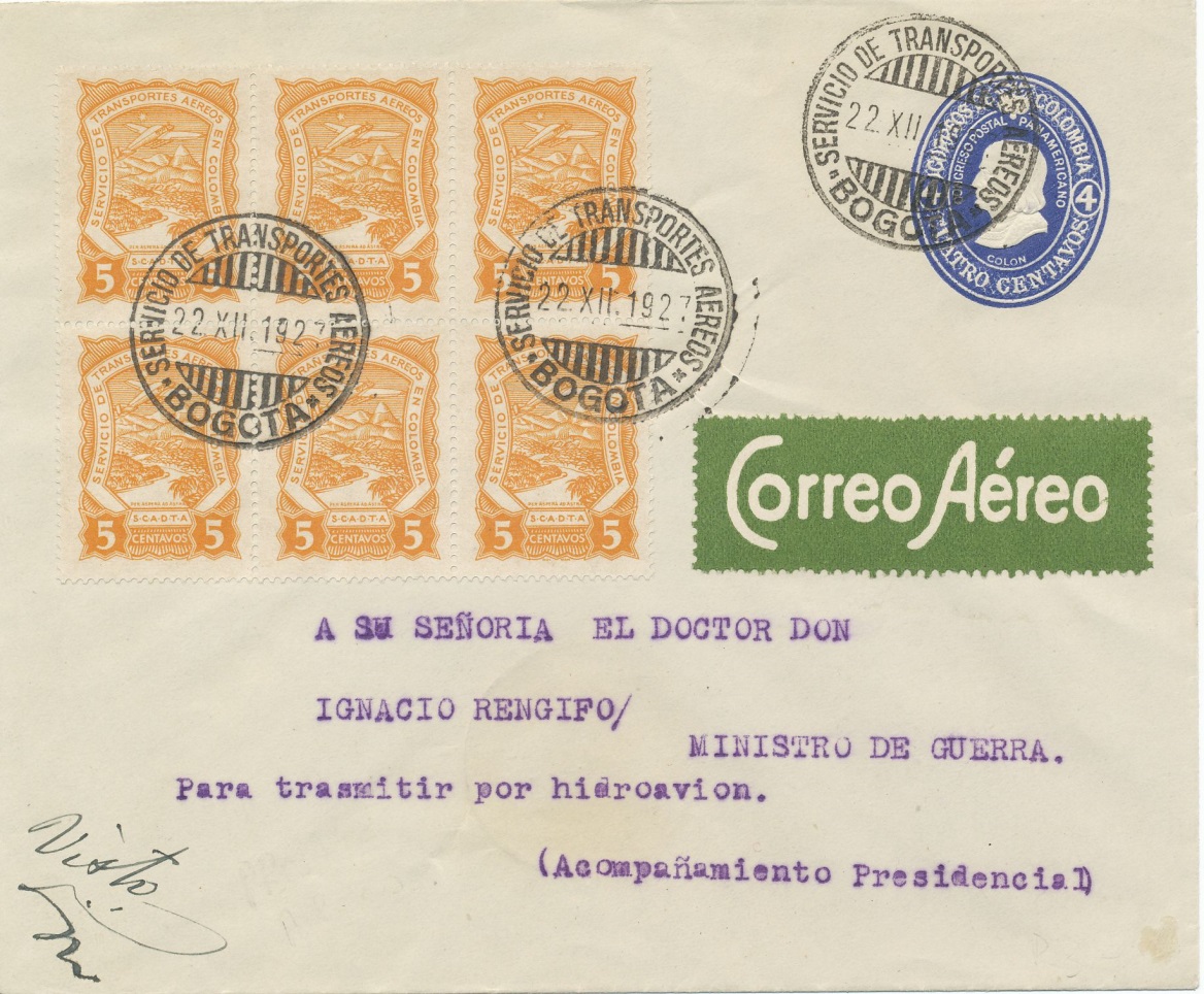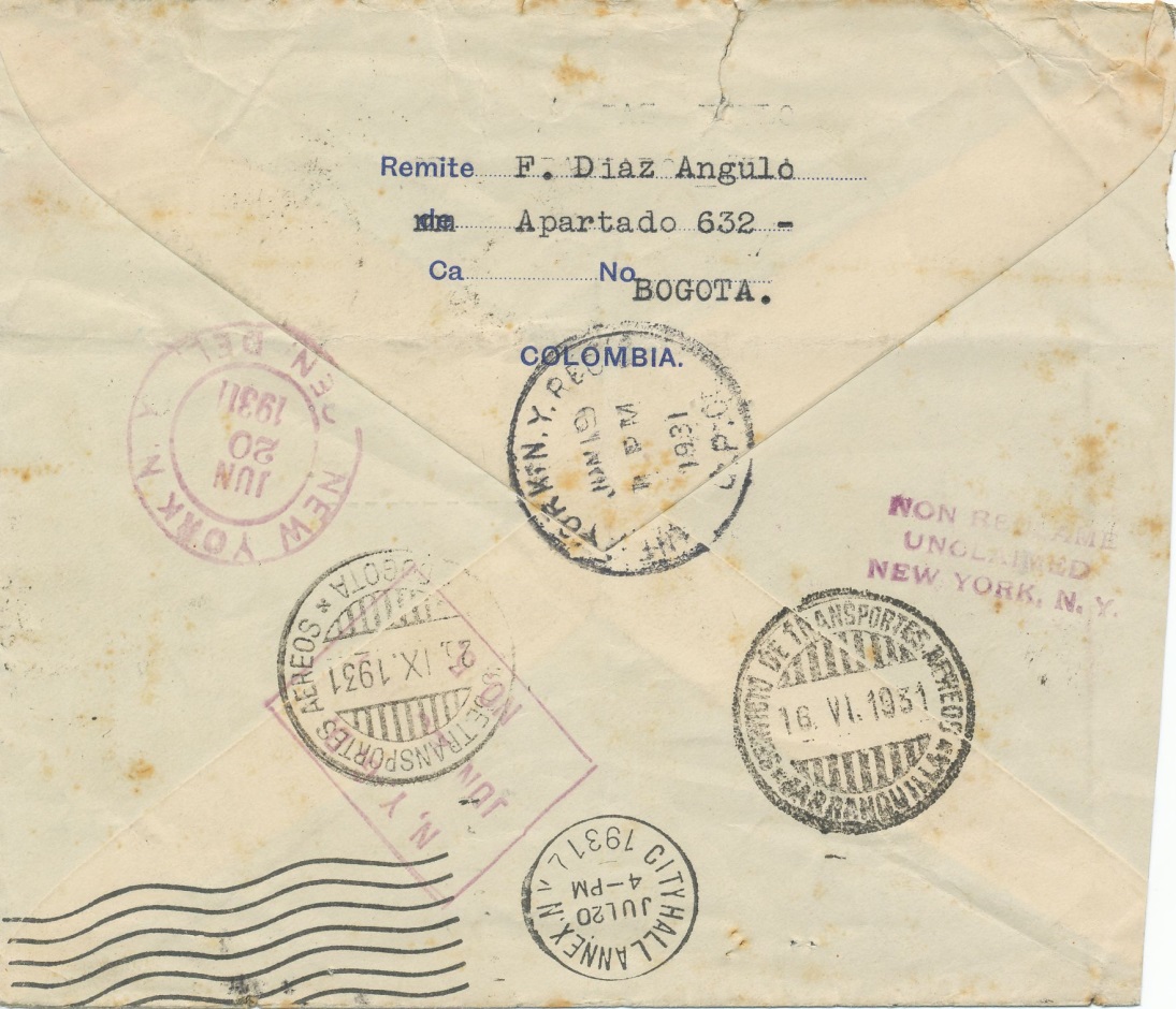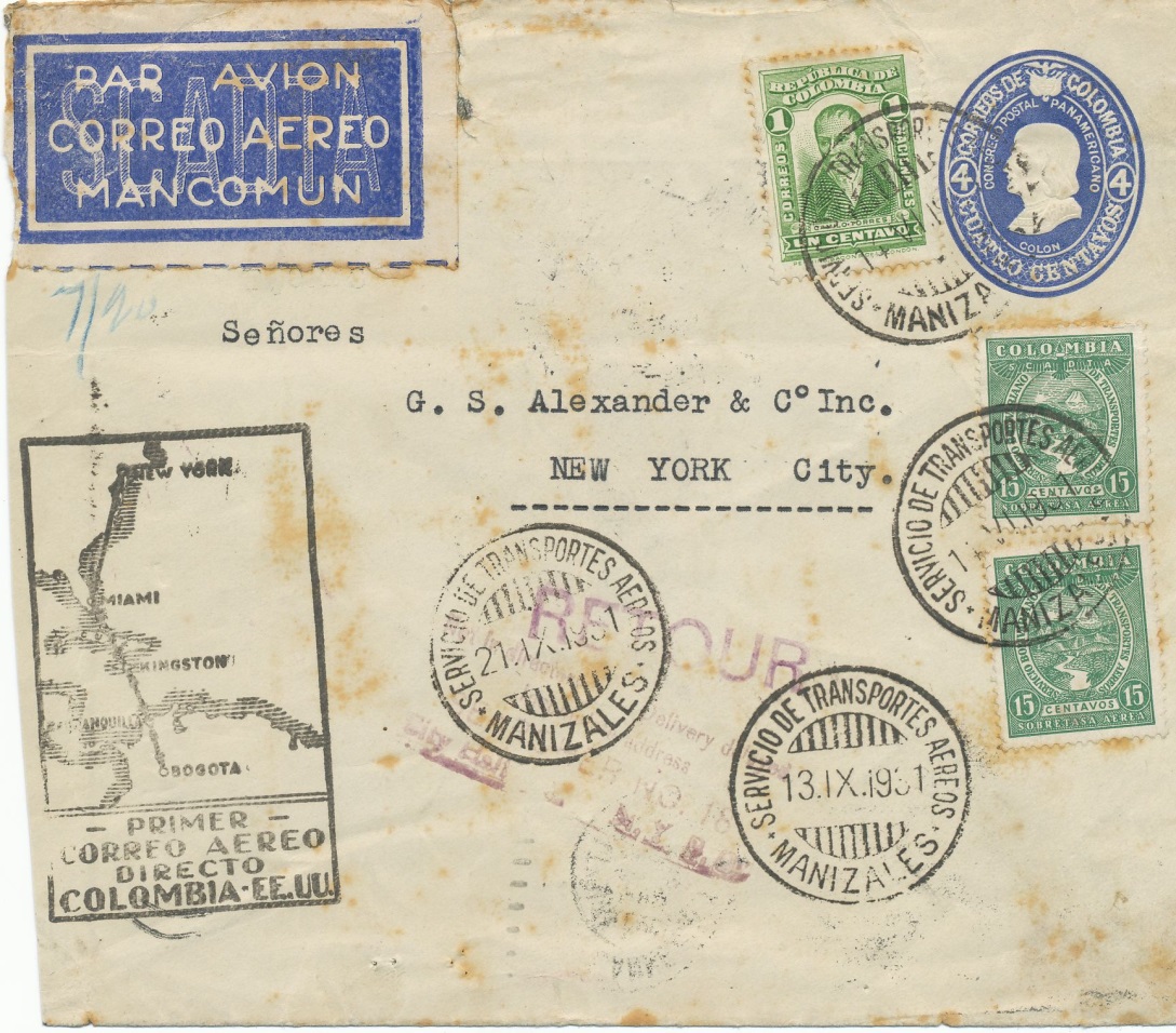 Carta enviada a N.Y. en el primer vuelo directo Colombia-EE.UU. que se celebró el 13 de septiembre de 1.931.-