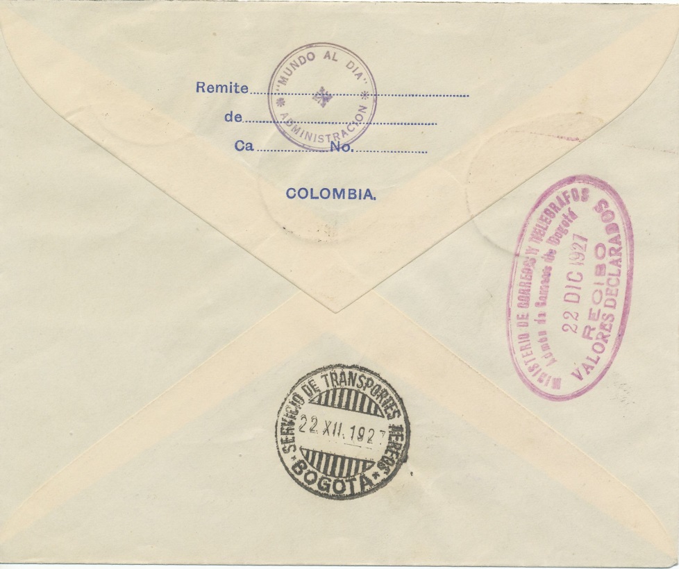 En la parte posterior podemos ver el cuño del remitente “mundo al día” (posiblemente un periódico) y otro segundo cuño de “valores declarados” de la misma fecha que los matasellos.-