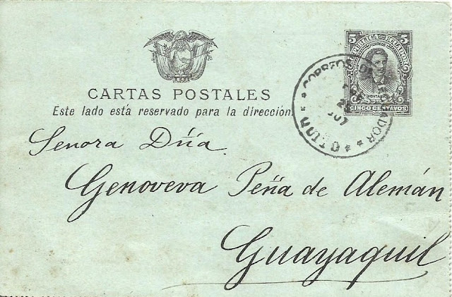 To sum up the story of the Juan Montalvo letter card we have established that it was used beginning January, 1907, but that its usage was only legalized on August 3, 1911. It was replaced by one with a black control mark on February 10, 1913 and by one with a red control mark on July 18, 1919. Subsequently, the remainders were demonetized and used for a variety of other reasons.