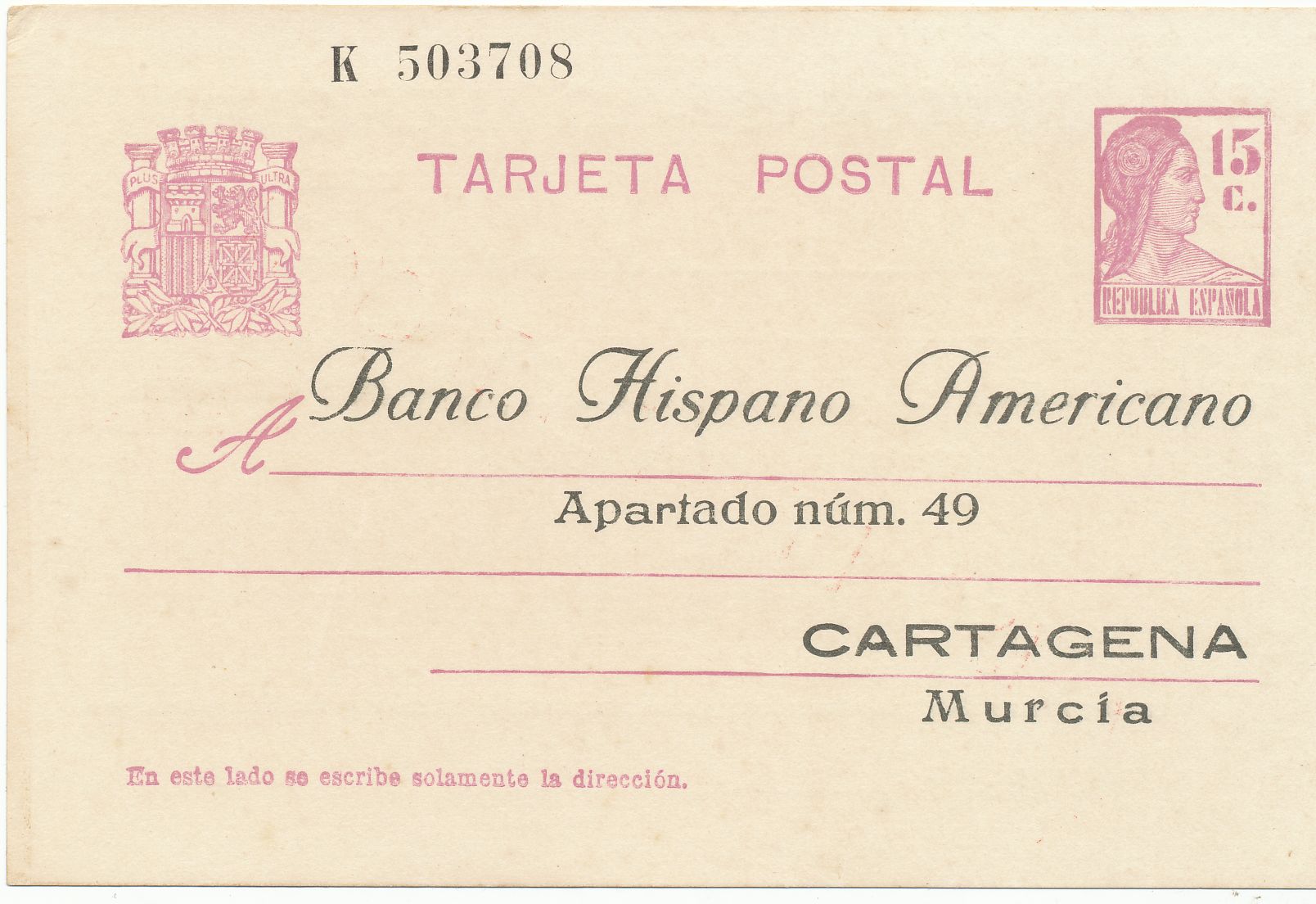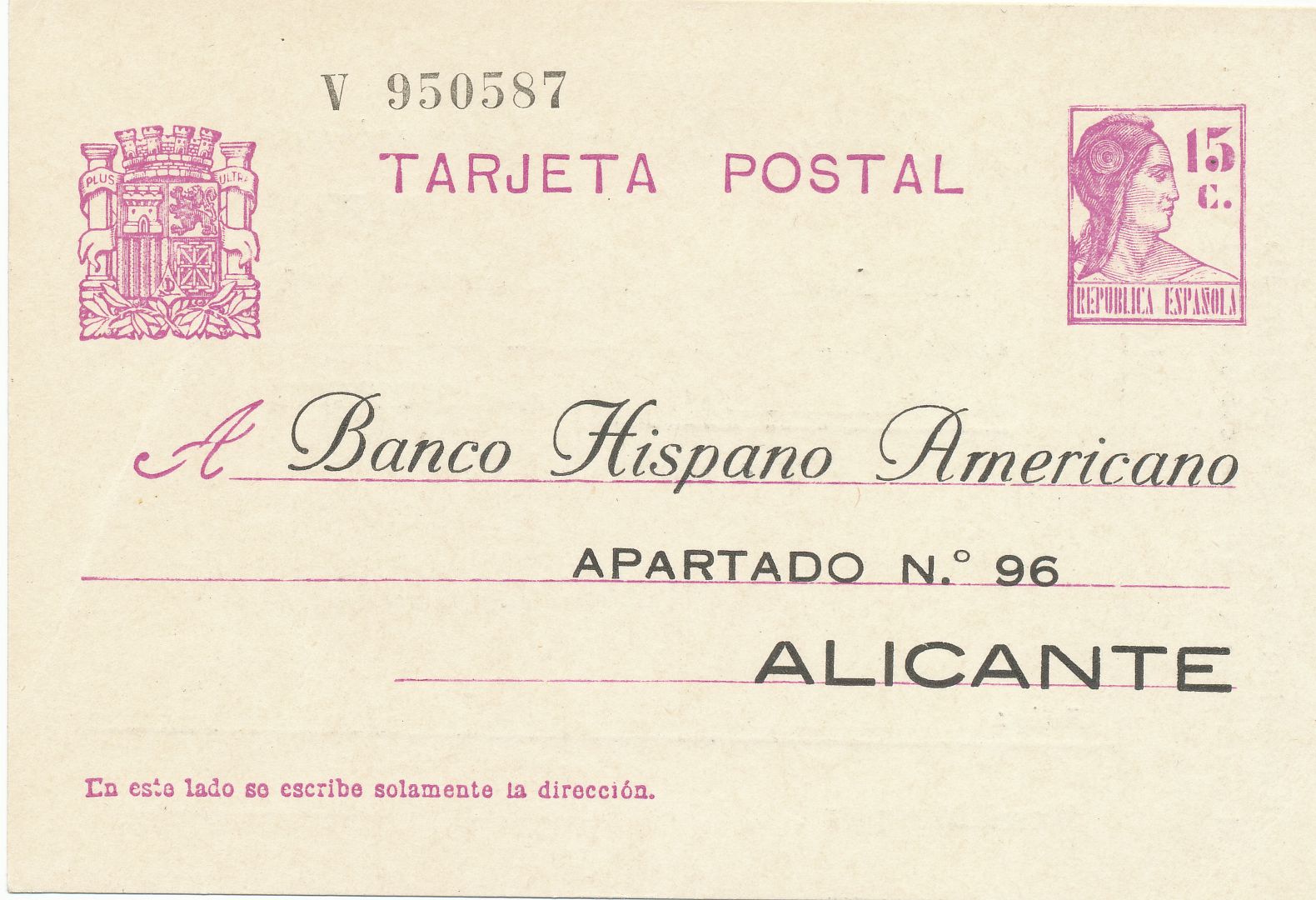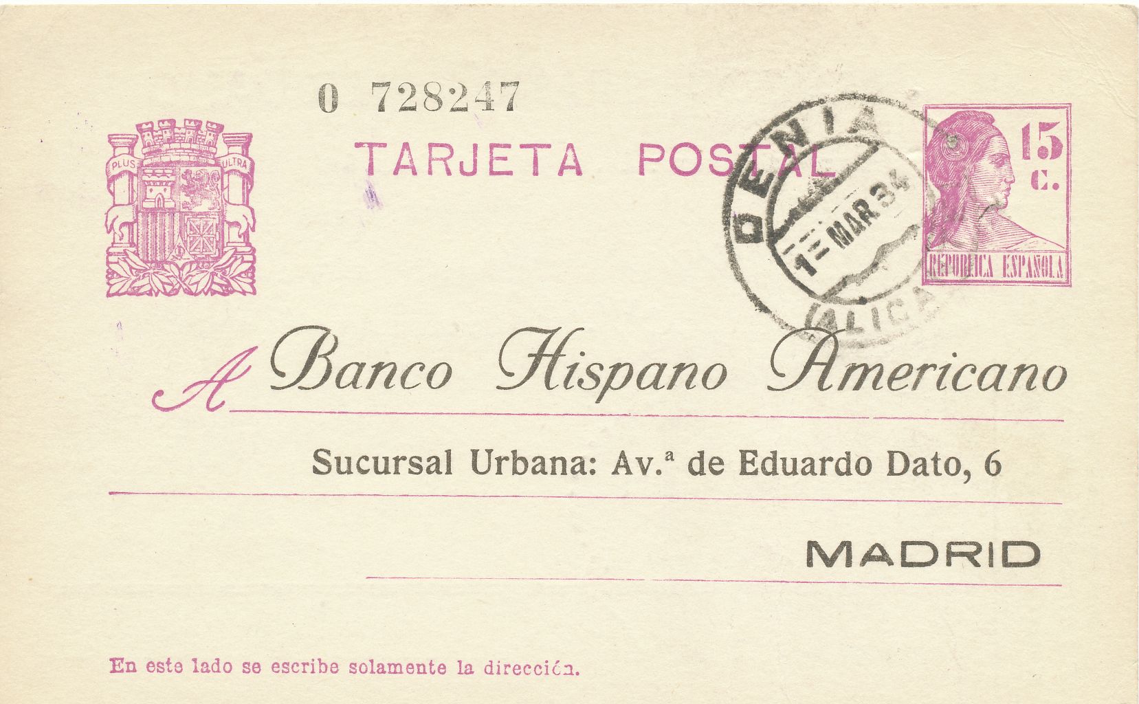 En el caso de esta tarjeta fue enviada desde Denia a la sucursal que el banco tenía en la Avenida de Eduardo Dato 6 en Madrid el día 1 de marzo de 1.934.-