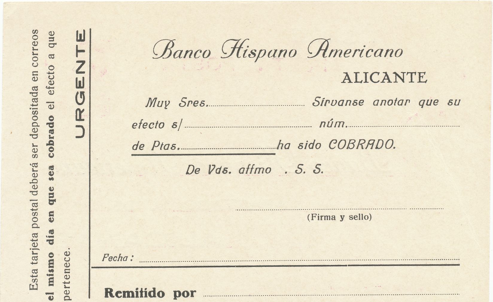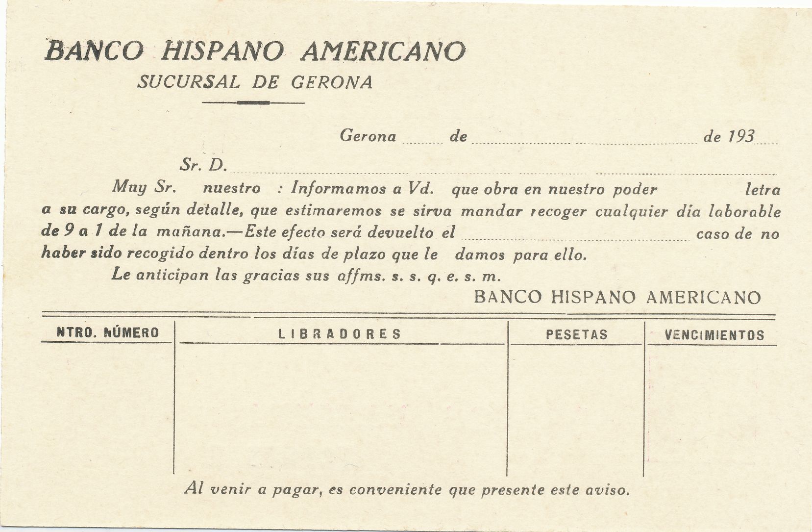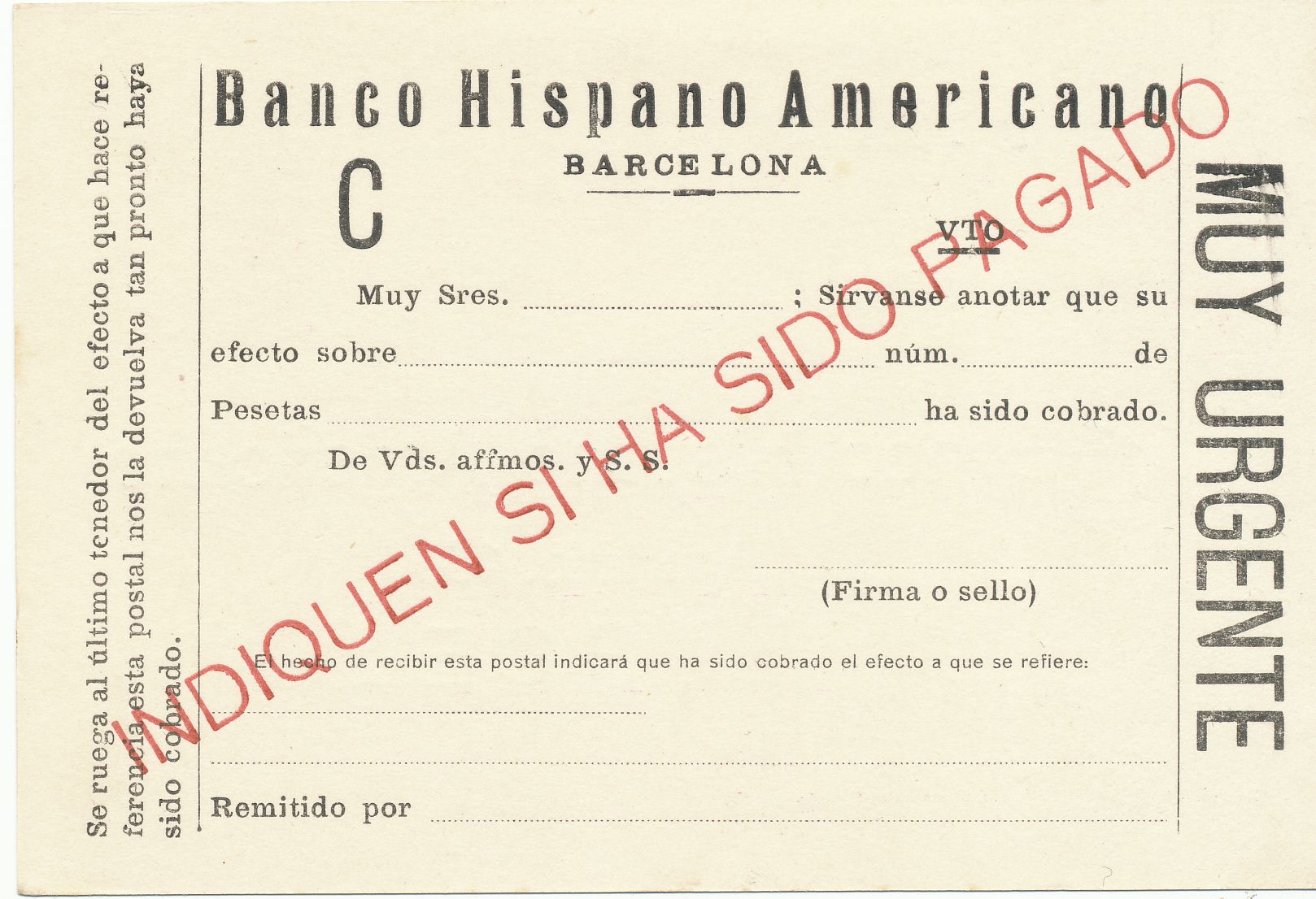 Tarjeta repartida a los clientes desde las oficinas del Banco Hispano Americano de Barcelona.-