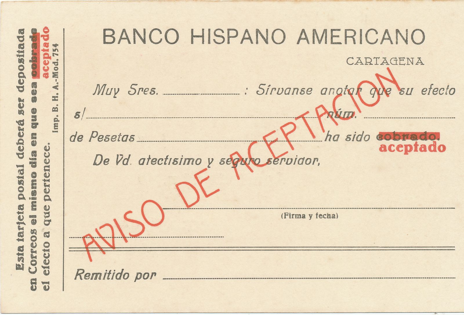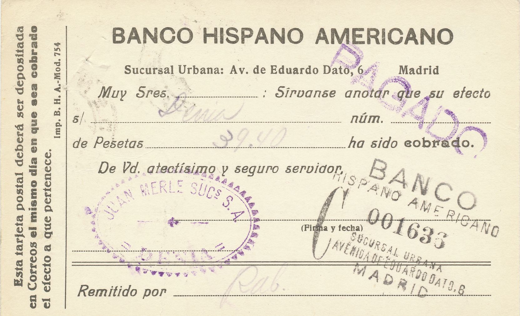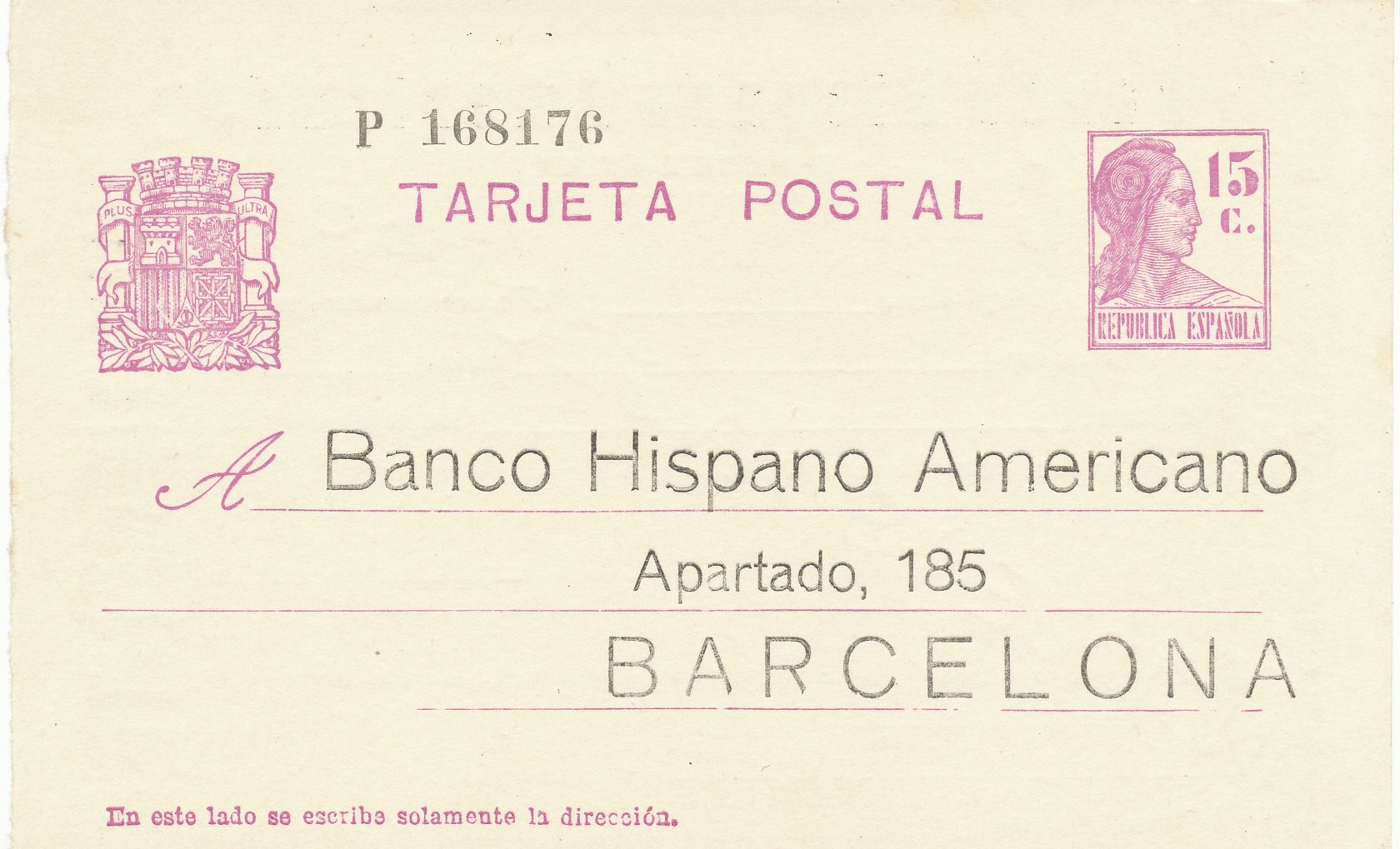 Tarjeta repartida a los clientes desde las oficinas del Banco Hispano Americano de Barcelona.-