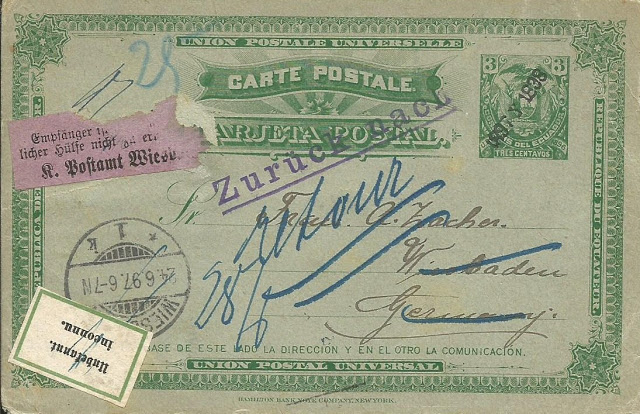 1897 Y 1898 on 1896 postal stationery card mailed to Wiesbaden where it arrived on June 6, 1897 and returned because of unknown addressee |