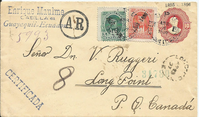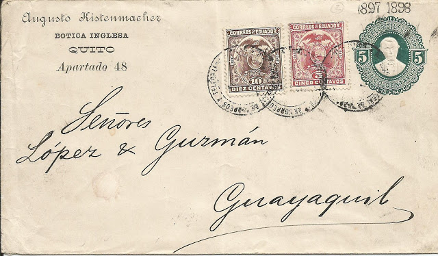 1897-1898 large numbers on 1894 postal stationery envelope with stamps added, mailed from Quito to Guayaquil |