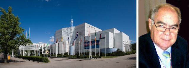 El Salón de Congresos de Tampere, sede de la Exposición europea, y Bernie Beston, oro con su colección de enteros ecuatorianos
