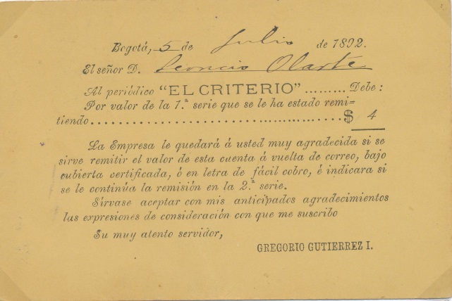 En el caso de que la tarjeta hubiese sido impresa en el año,1.891, el marco en el que nació seria parecido al anterior, y en el caso de que lo hubiese sido el año 1.901, será bajo la Presidencia de José Manuel Marroquín, quien ese año tenía que enfrentarse a las guerrillas revolucionarias que operaban con ayuda de Nicaragüenses Venezolanos y Ecuatorianos, en la zona Atlántica , con esta guerrilla consiguió acabar con la firma de varios tratados, el primero de los cuales se firmó el 24 de octubre de 1.902 en Neerlandia.-