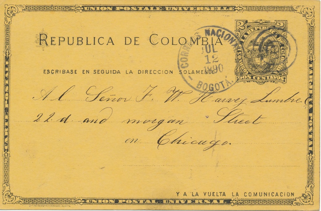 Tarjeta enviada a Chicago el 12 de julio de 1.890, desde Bogotá.-