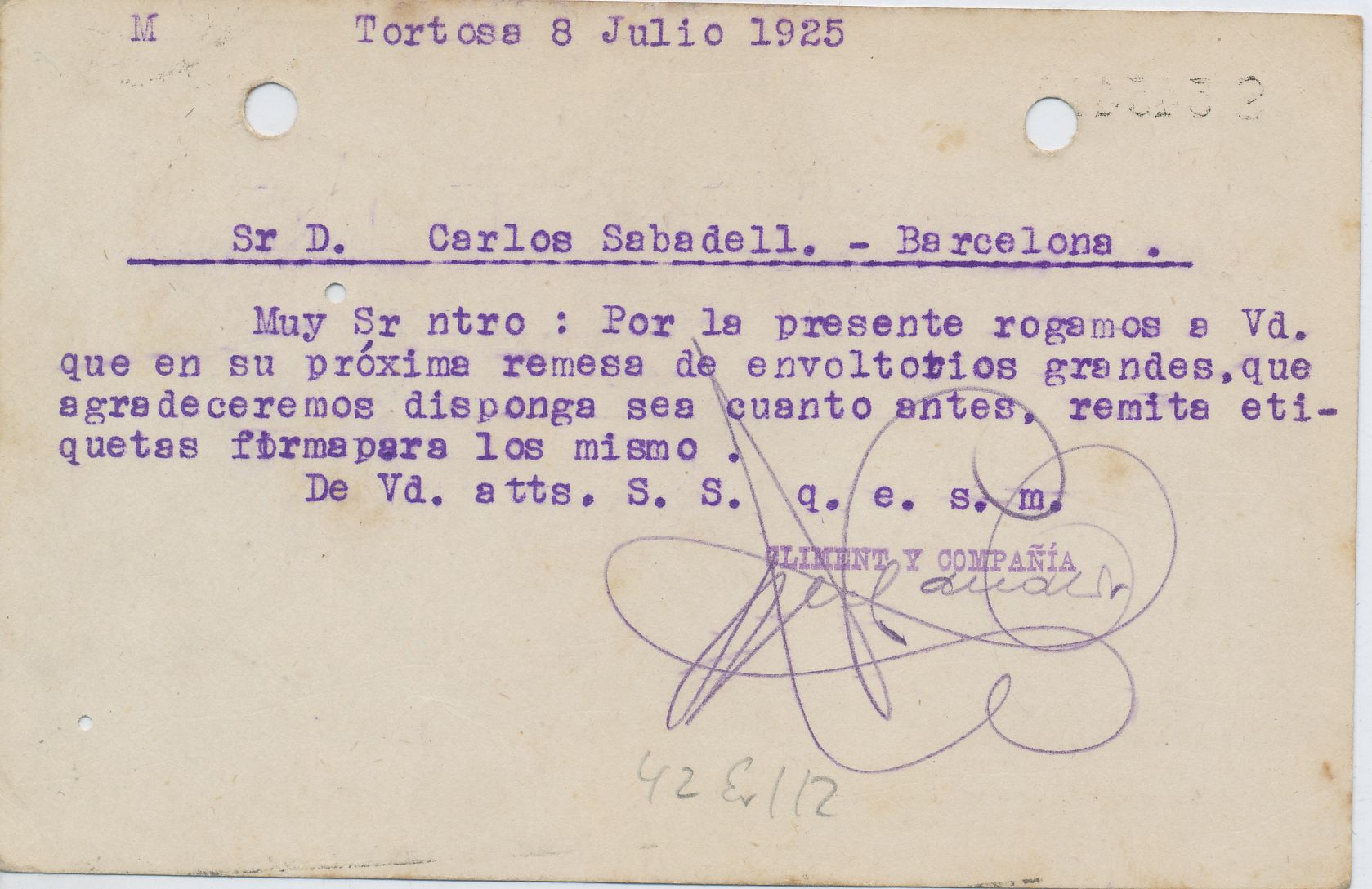 La tarjeta esta enviada desde Tortosa a Barcelona el día 8 de julio de 1.925.-se puede ver un matasellos de salida borroso en la parte frontal, sin mas marcas postales.-