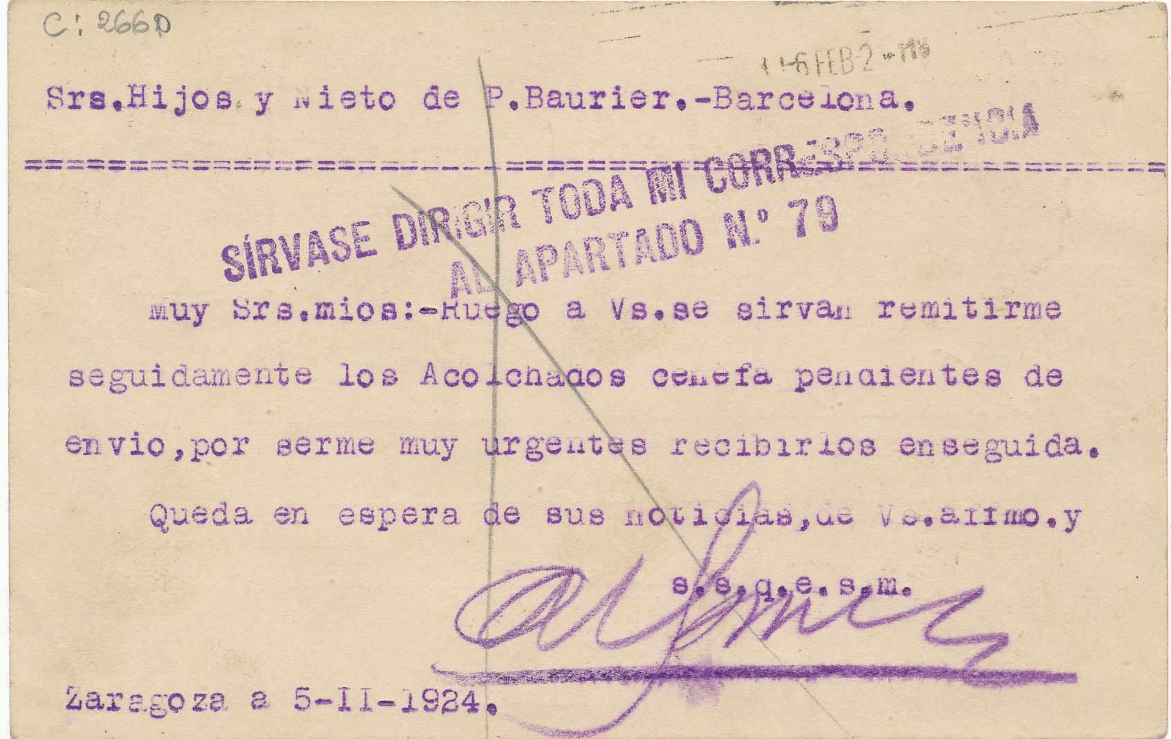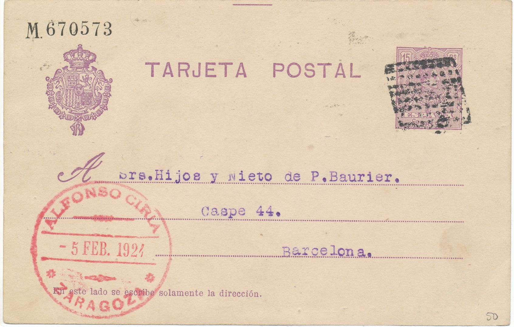 Tarjeta enviada desde Zaragoza l día 5 de febrero de 1.924 a Barcelona,