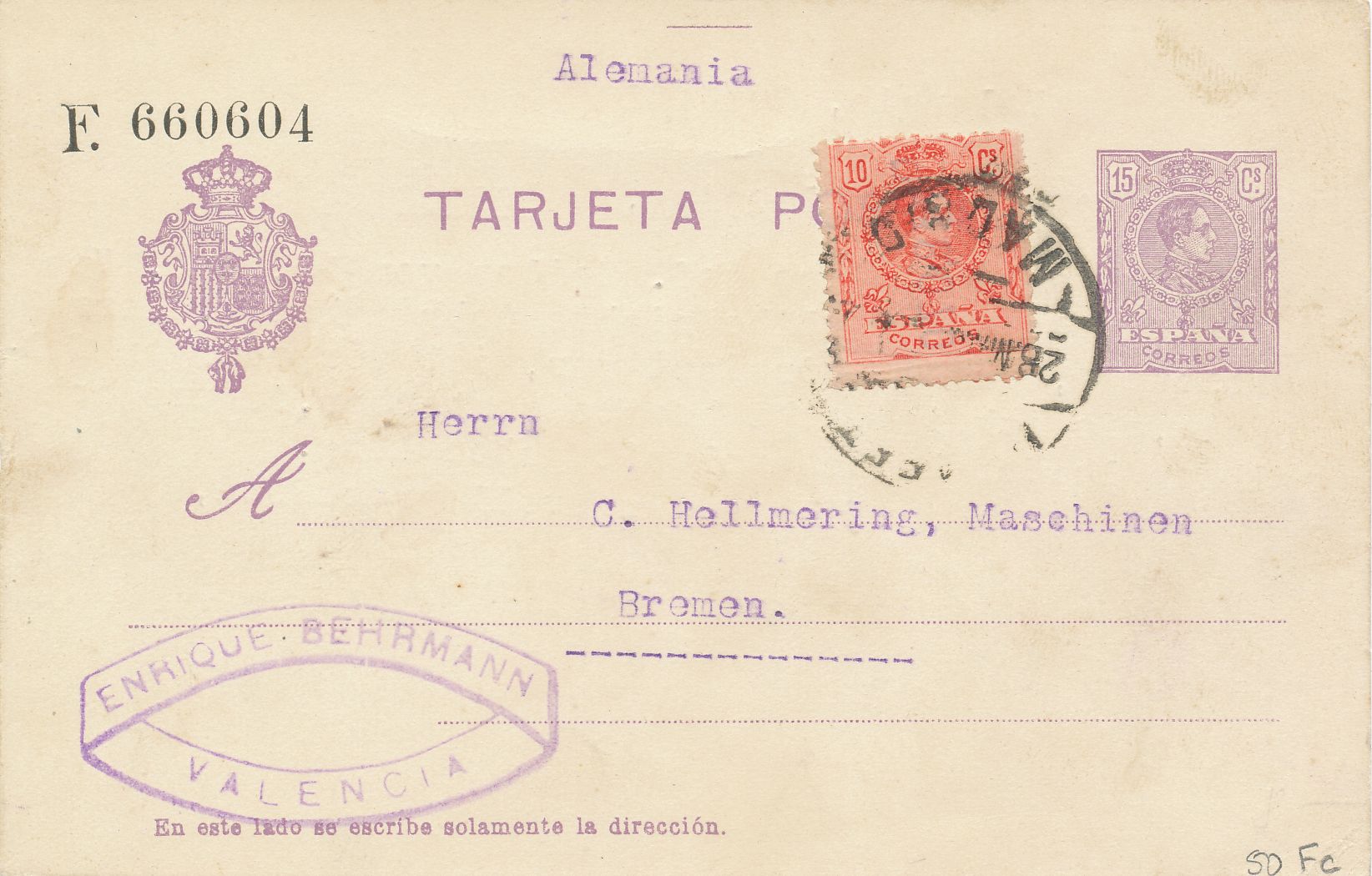 Tarjeta enviada desde Valencia a Bremen Alemania, el día 28 de marzo de 1.922, borroso cuño de salida en la parte frontal, sin más marcas postales.-