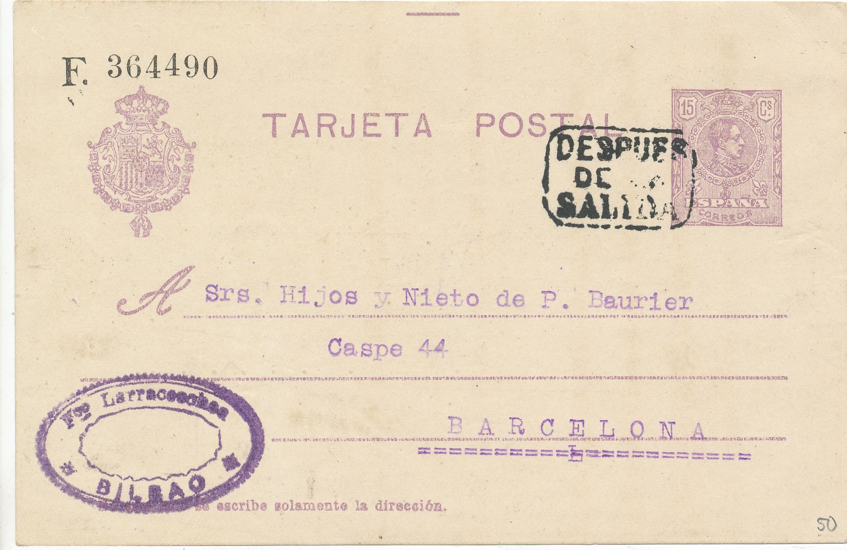 Tarjeta enviada desde Bilbao el día 13 de marzo de 1.922 a Barcelona, cuño “después de la salida” en la parte frontal sin más marcas postales.-