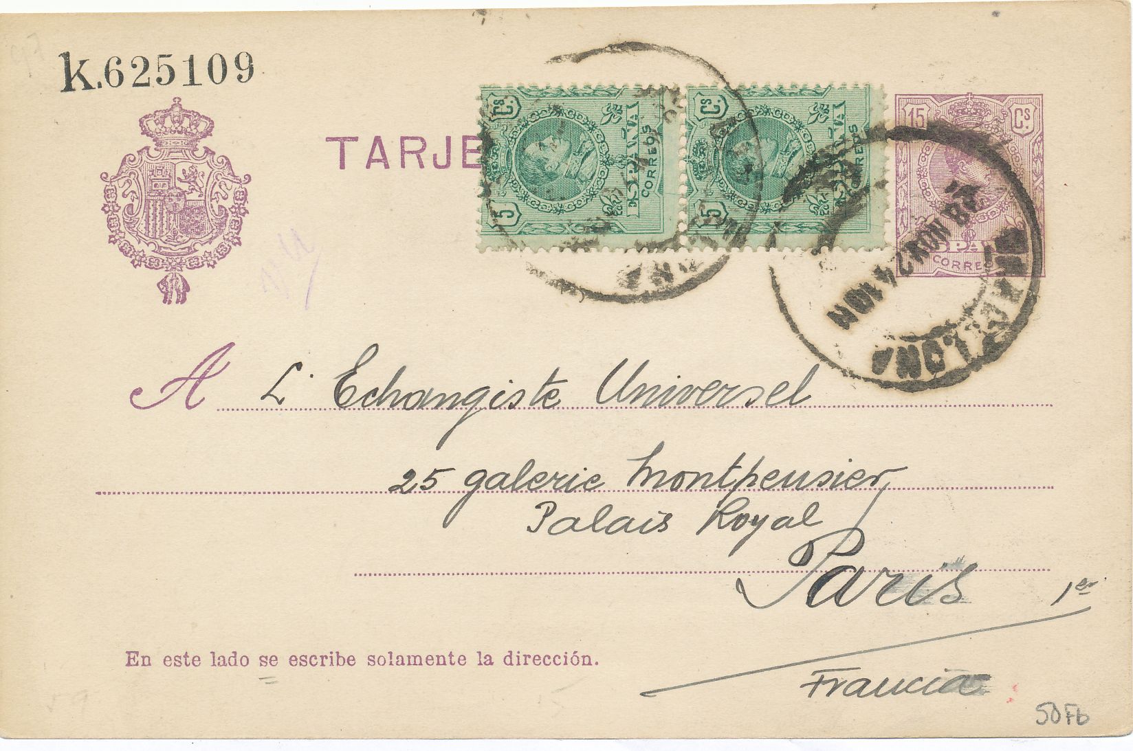 Franqueo correcto: el día 8 de julio de 1.925, estaban en vigor las tarifas ordenadas el día 1 de agosto de 1.922, el franqueo urbano e interurbano era de 15 centimos y el internacional de 25 centimos.-