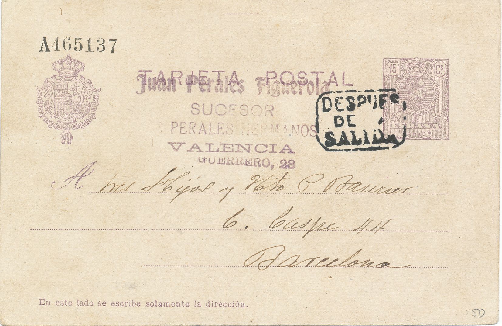 Tarjeta enviada desde Valencia a Barcelona el día 17 de agosto de 1.920.en la parte frontal podemos ver una marca postal “Después de la salida”.-