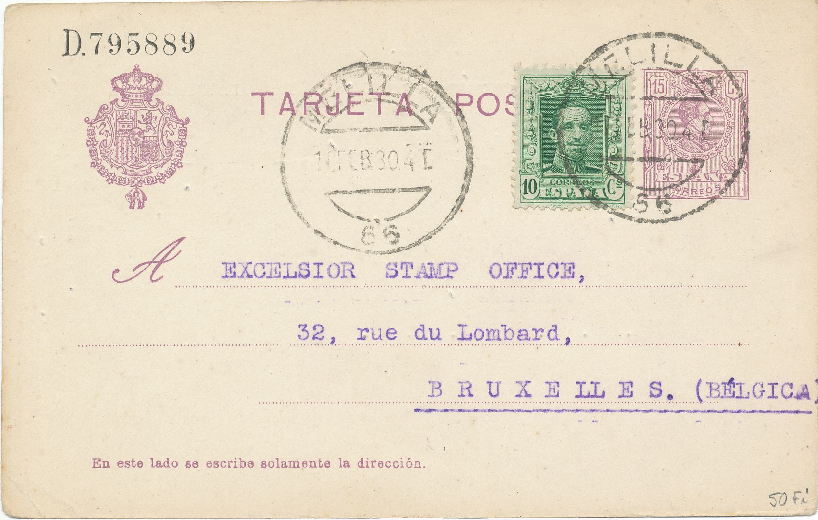 Tarjeta enviada desde Melilla a Bruselas el día 11 de febrero de 1.930 cuños de salida en la parte frontal, sin más marcas postales.-