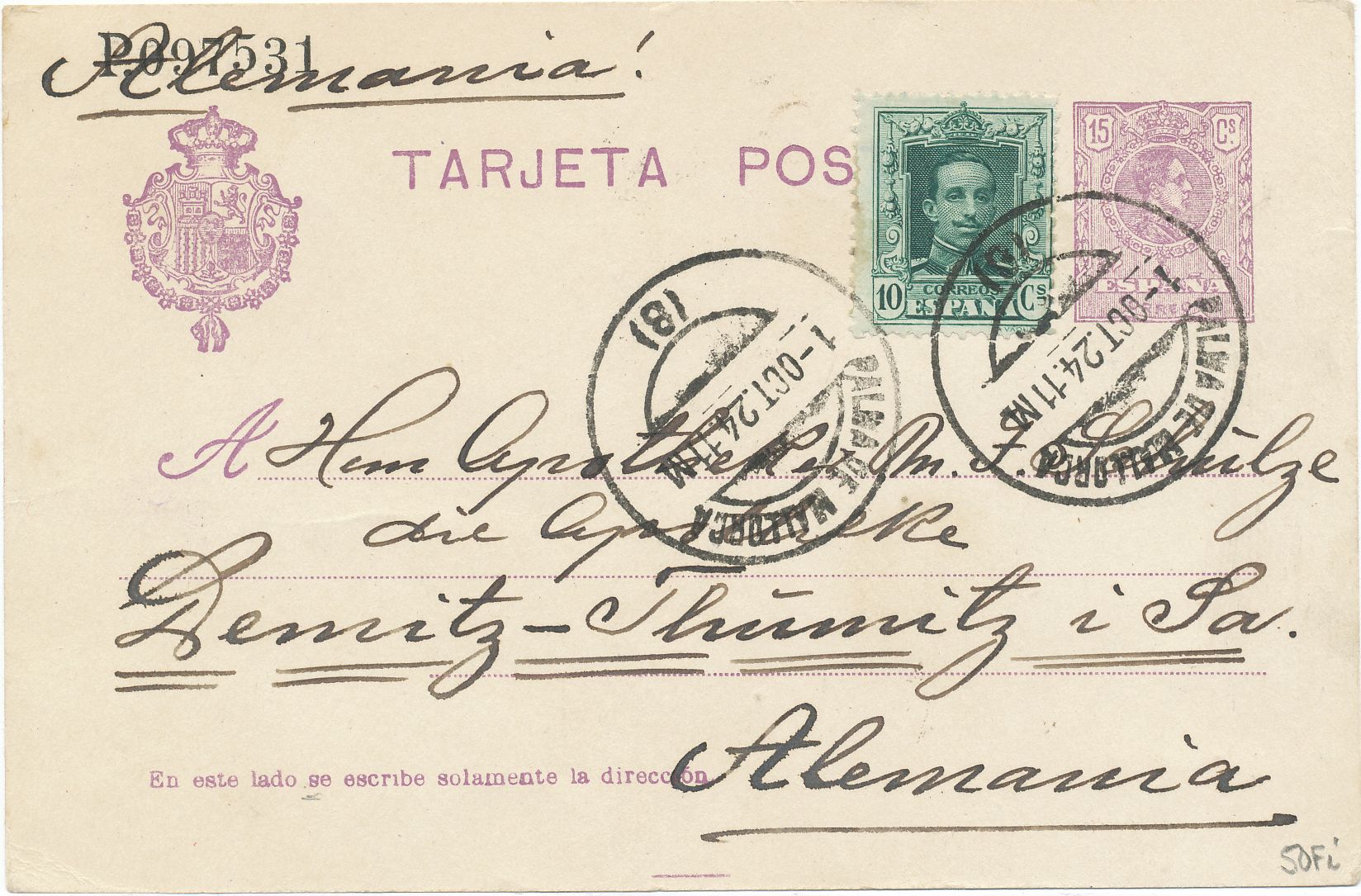 Tarjeta enviada el día 1 de octubre de 1.924 desde Palma de Mallorca a Alemania, cuños de salida en la parte frontal sin más marcas postales.-