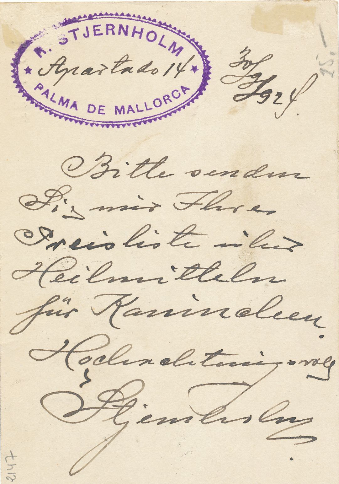 Privatizada mediante cuño ovalado, que permite introducir información por R. Stjernholm, de Palma de Mallorca.-