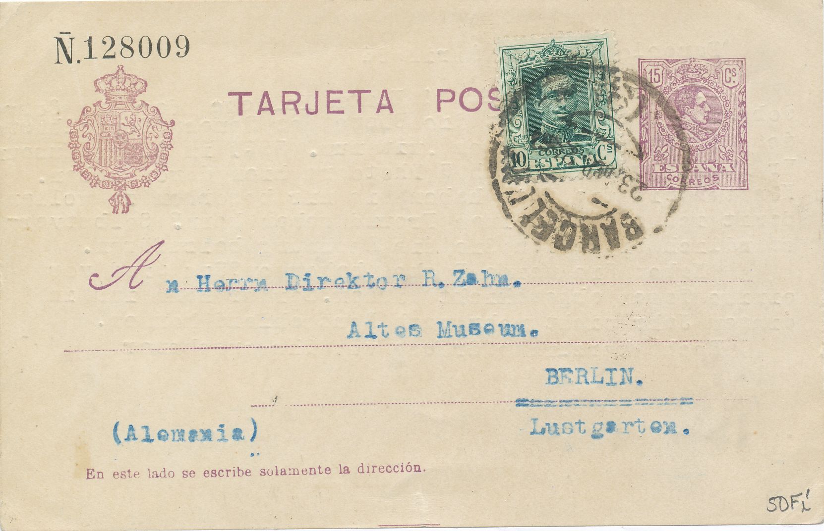 Tarjeta enviada desde Barcelona el día 22 de abril de 1.924 a Berlín, cuño de salida borroso, en la parte frontal, sin más marcas postales.-
