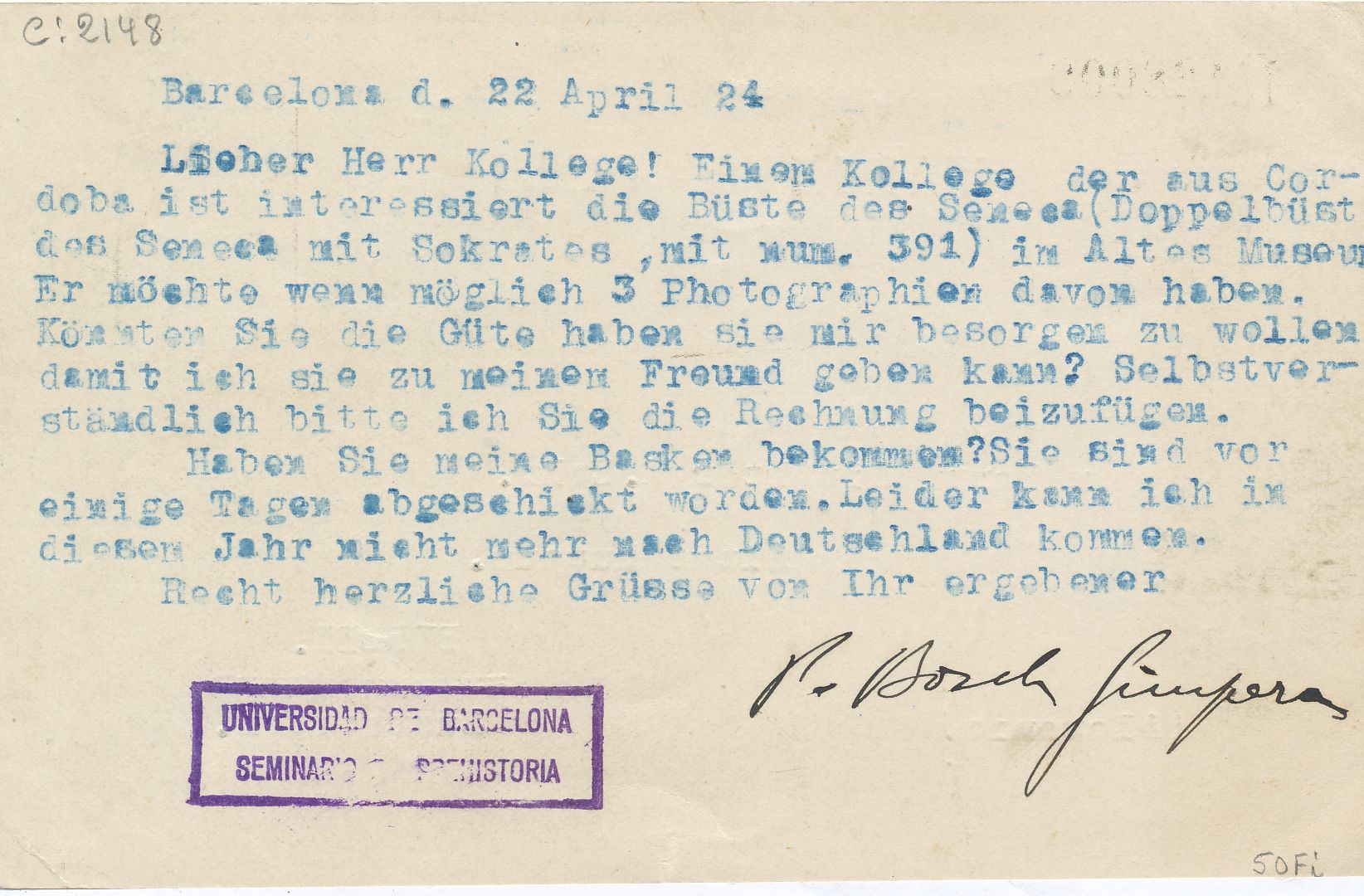 Privatizada mediante cuño rectangular del seminario de prehistoria de la Universidad de Barcelona.-