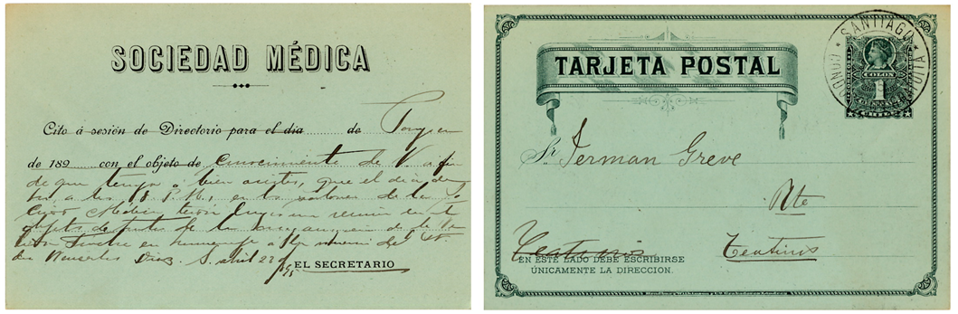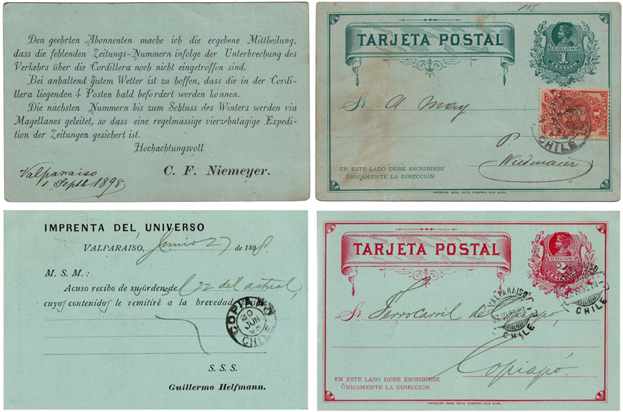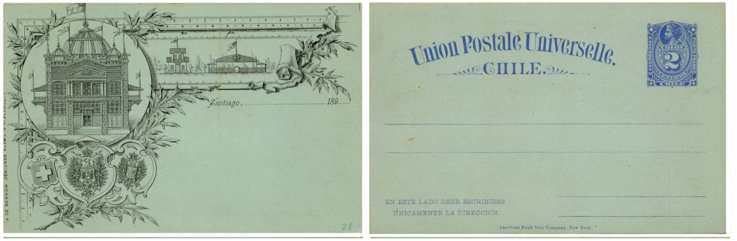 Las tarjetas hechas para la Exposición de Minería y Metalurgia, de Santiago 1894 (fig. 55), si bien están pre-impresas, ellas fueron concebidas con la intención de ser usadas como tarjetas postales, debiendo cancelar en franqueo en las que están impresas. Pero no se podría descartar la posibilidad que se hayan usado correctamente para el envío de material impreso internacional.