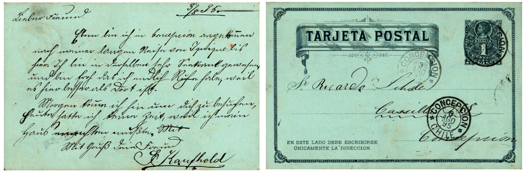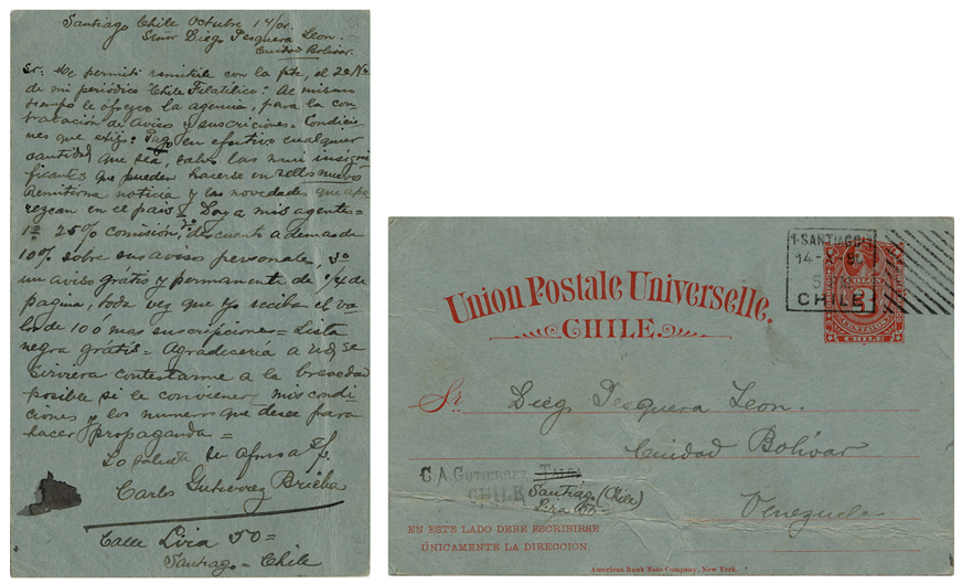 El tercer ejemplo (fig. 61) es una tarjeta local de Concepción de 1895 escrita completamente a mano con un texto personal, por lo que este es un uso completamente incorrecto como material impreso, y debió sin duda alguna considerarse como carta y multarse con 2 cts. adicionales por el centavo faltante. El cuarto ejemplo es una tarjeta enviada de Valparaíso a Santiago en 1895 (fig. 62), no cumplía con las normas para material impreso, se consideró como carta y se le aplicó correctamente una multa de 2 cts., doble del centavo faltante.