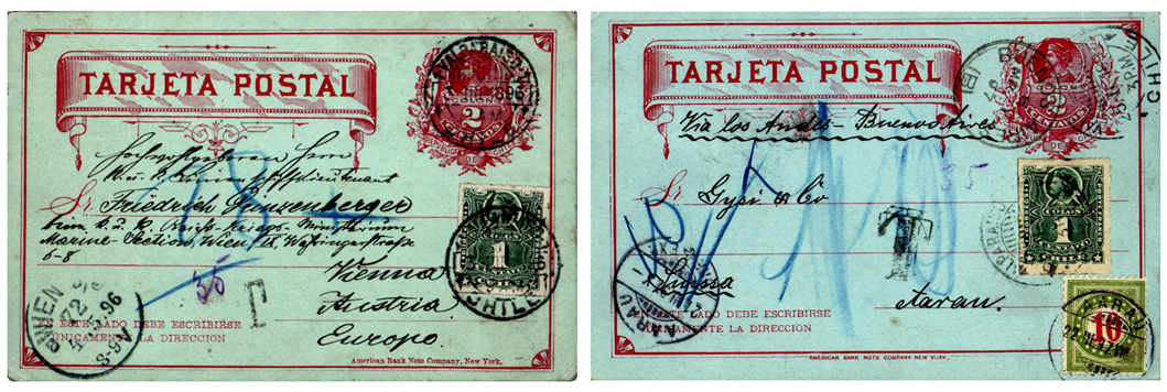 A continuación dos ejemplos de interpretación de la forma de aplicar las multas en Chile y en el extranjero según la normativa del ArtículoV 2,3. La tarjeta fig. 46 fue enviada de Valparaíso el 3 de abril de 1896 arribando a Wien, Austria el 4 de mayo de 1896, con franqueo para completar los por 3 cts. de una tarjeta internacional, fue multada por ser una tarjeta de uso nacional, no cumplía las condiciones UPU para el envío internacional, se consideró como una carta, por lo que la deficiencia en el franqueo era de 7 cts. o 35 céntimos de ff oro, que se señaló con la marca "T" y el número 35 en violeta. La multa correspondiente es de 70 céntimos de ff oro, por lo que se cobraron 28 kreuzer de multa indicados en color azul (1kreuze =1.5 céntimos de ff oro). Este ejemplo comprueba el uso adecuado de la reglamentación UPU, pero no fue una regla general.