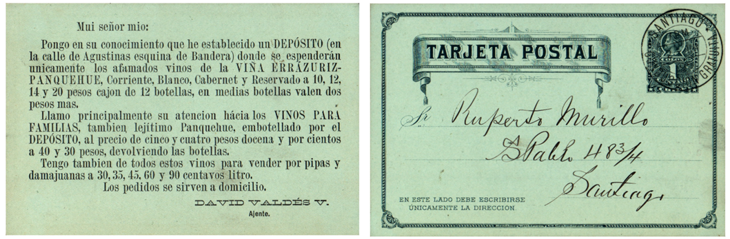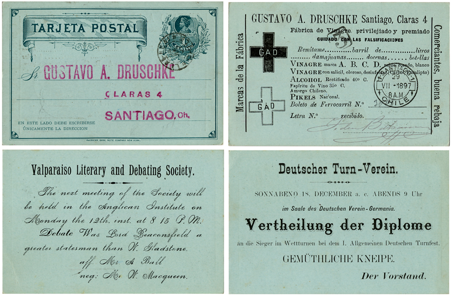 En la tarjeta de la Imprenta del Universo de Valparaíso de 1898 (fig. 65) es un caso de tarjeta pre-impresa con un texto para acusar recibos de trabajo, formulario administrativo, que no estaba pensado para el envío en grupos, de modo que se imprimieron en tarjetas con tarifa de postal nacional de 2 cts., no pudiendo aprovechar la tarifa reducida.
