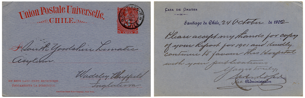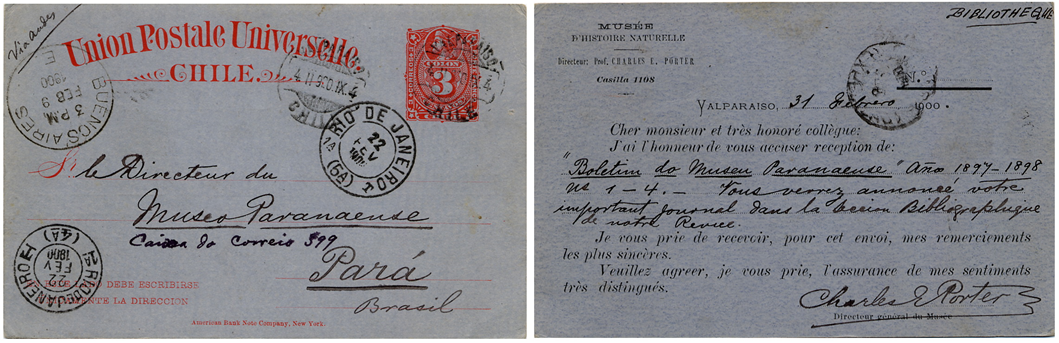 A continuación dos ejemplos de tarjetas pre-impresas, la primera (fig. 67) enviada de Valparaíso el 4 de febrero de 1900 a Pará, Brasil, tránsito por Río de Janeiro y Buenos Aires el 9 de febrero de 1900, del Musee D’Historie Naturelle de Valparaíso y la segunda tarjeta (fig. 68) enviada de Santiago el 1º de noviembre de 1902 a Wadsley, Sheffield, Inglaterra por la “Casa de Orates” de Santiago.