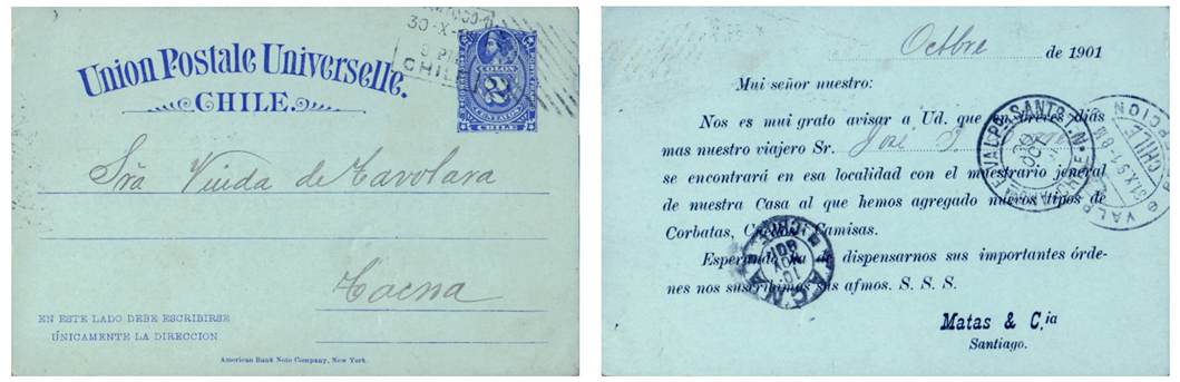 La tarjeta de la fig.53, enviada a Tacna, en 1901, informando la visita de un vendedor, de la que muy probablemente hubiese sido imposible enviar 20 de una sola vez, y estaban destinadas a ser enviadas en repetidas ocasiones informando lo mismo, a distintas partes en diferentes ocasiones.