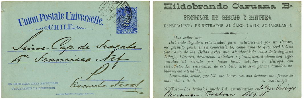 La tarjeta de la fig.54, local de Valparaíso 17.12.1901 es una propaganda de un Profesor de Dibujo y Pintor, posiblemente el uso de tarjetas de 2 cts. en vez de 1 ctvo. se debe a las mismas razones antes explicadas, además es probable que la tarifa reducida para material impreso no fuera de amplio conocimiento de los particulares.