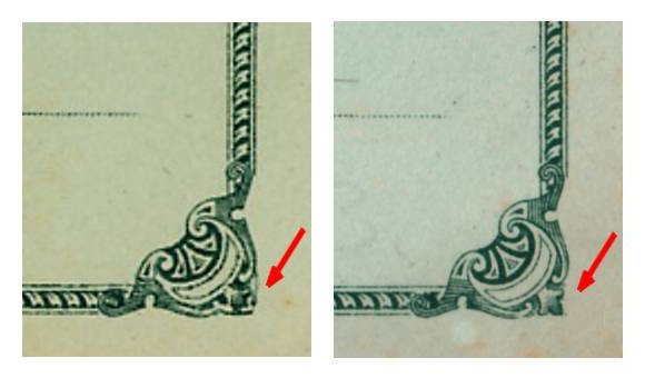 Como en lo general de las tarjetas la calidad de impresión es muy buena y solo he detectado una diferencia de retoque en el borde inferior derecho de uno de los cuños de la plancha de impresión (fig. 58).