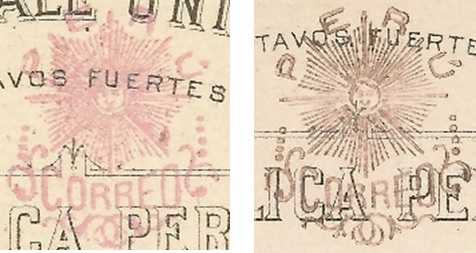 Las tarjetas de la emisión en referencia eran de tres valores (tres, cuatro y cinco centavos), y la que nos interesa es la doble de cinco centavos con el resello en color rosa, lo que la diferencia de la tarjeta sencilla con el mismo valor, cuyo resello es violeta.