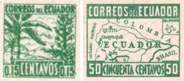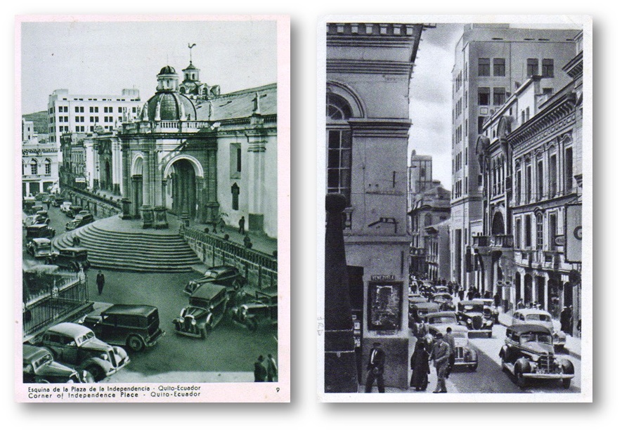 A la izquierda, tarjeta vista de la primera emisión (atrio de la Catedral, en Quito); a la derecha, tarjeta de la segunda emisión (esquina de la calles Espejo y Venezuela, en Quito). La esquina de la capital del Ecuador que se muestra en la tarjeta de la segunda emisión, es la misma que aparece al fondo en la tarjeta de la izquierda. |